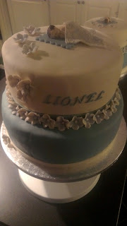 Det var dags för dop och jag gjorde två tårtor med detta utseende till lilla Lionels dopdag. Önskemålet var blått och vitt samt att namnet skulle finnas med sedan så fick jag fria händer så länge tårtorna såg ut som doptårtor. Tillslut blev resultatet av egen design såhär, lyckades jag få in dopkänslan? Nu fick jag återigen öva på att göra våningstårtor, det var ju ett tag sedan men det var kul. Tårtorna innehåller vaniljbottnar, chokladmousse, bananmousse, spacklade med vaniljglasyr och täckta samt dekorerade med marispan.